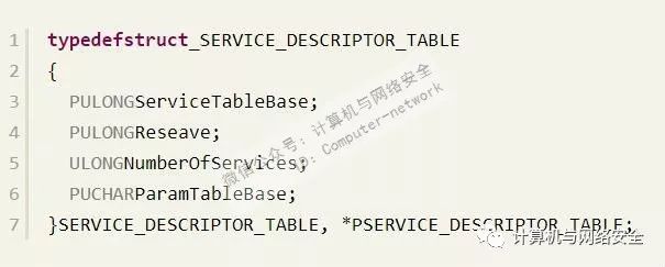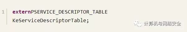 要想在驱动中获得该表,需要使用Notokrnl.exe导出的KeServiceDescriptorTable,将其定义如下: