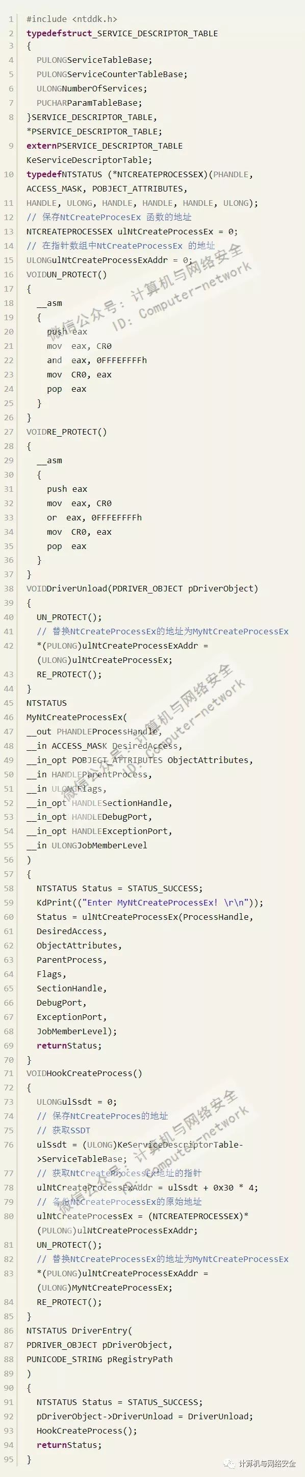 下面HOOK一个我们比较熟悉的函数,即创建进程函数NtCreateProcessEx()。该函数在指针数组的第0x30项(该编号根据系统版本的不同而不同,是系统相关的)。通过编程获取SSDT表,然后找到Native API的函数指针数组,然后修改其中第0x30项的内容为我们的函数地址,为了不影响进程的正常创建,在函数中调用NtCreateProcessEx()函数。代码如下: