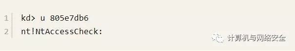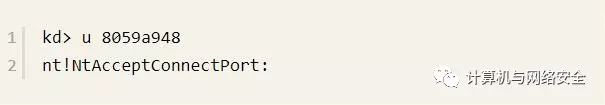 从输出可以看出,8059a948是NtAcceptConnectPort()函数的地址。再来看一个地址,输入u 805e7db6命令,输出如下:
