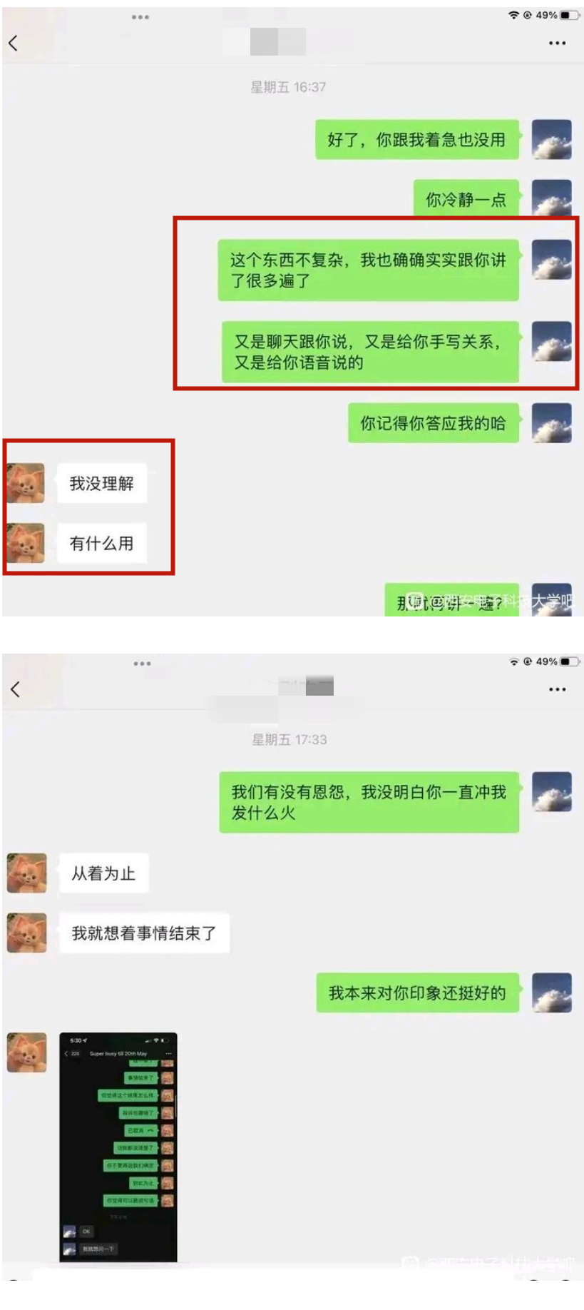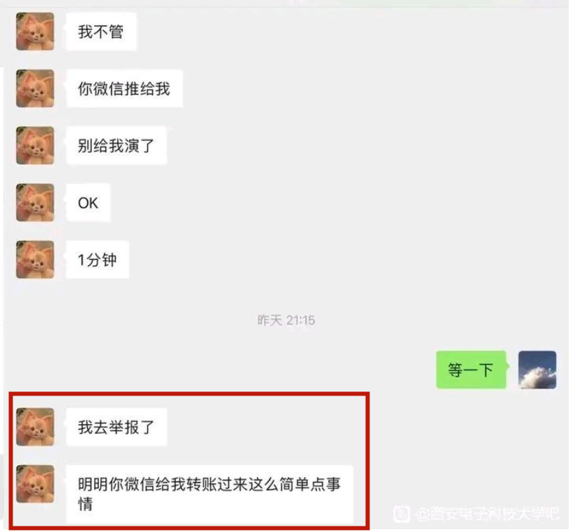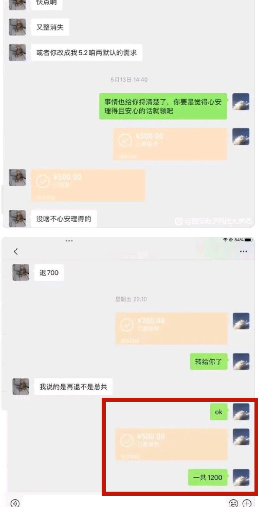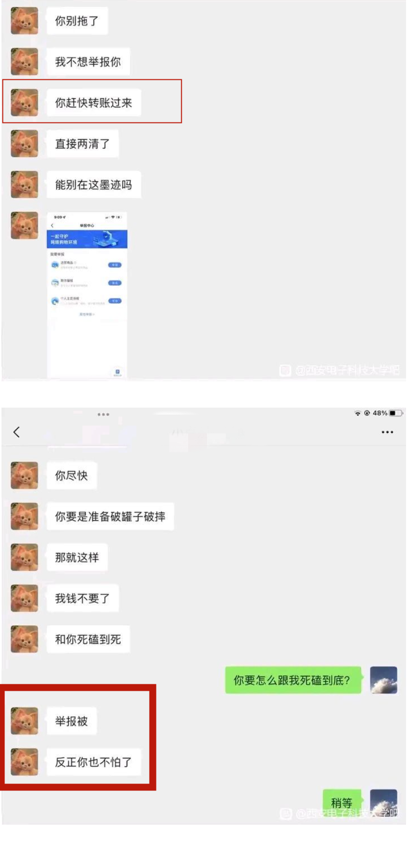 网帖表示,西电有两个大四学生找他代做项目,做完以后说是她们的毕设,然后拿着老师的要求找他做修改,但并没有加钱,可在自己尽力满足需求后,这2位学生又以他没有满足某项需求和回消息慢为理由,以闲鱼平台不支持代码此类商品交易的漏洞,以可以举报他为把柄三番五次跟他要钱,气不过的他发了此帖。