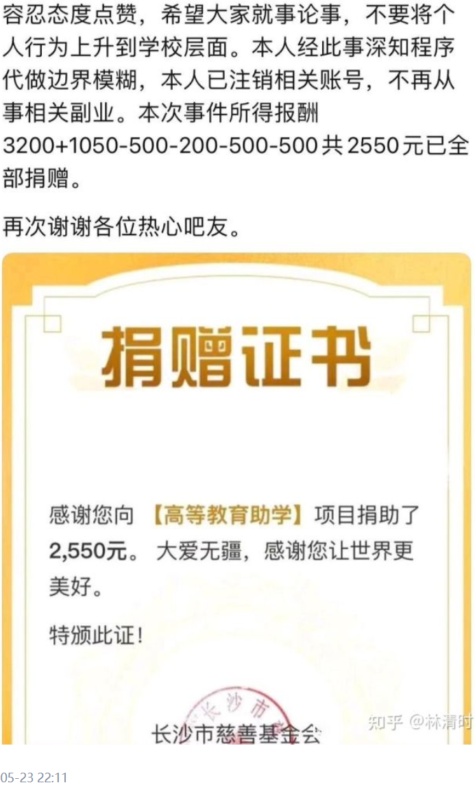 最后,根据网上的消息,此次的闲鱼枪手将剩下未退还给雷某某和卢某某的毕设报酬做了捐款处理,并表示已经深知程序代做边界模糊,已经注销相关账号,将不再从事相关的副业。