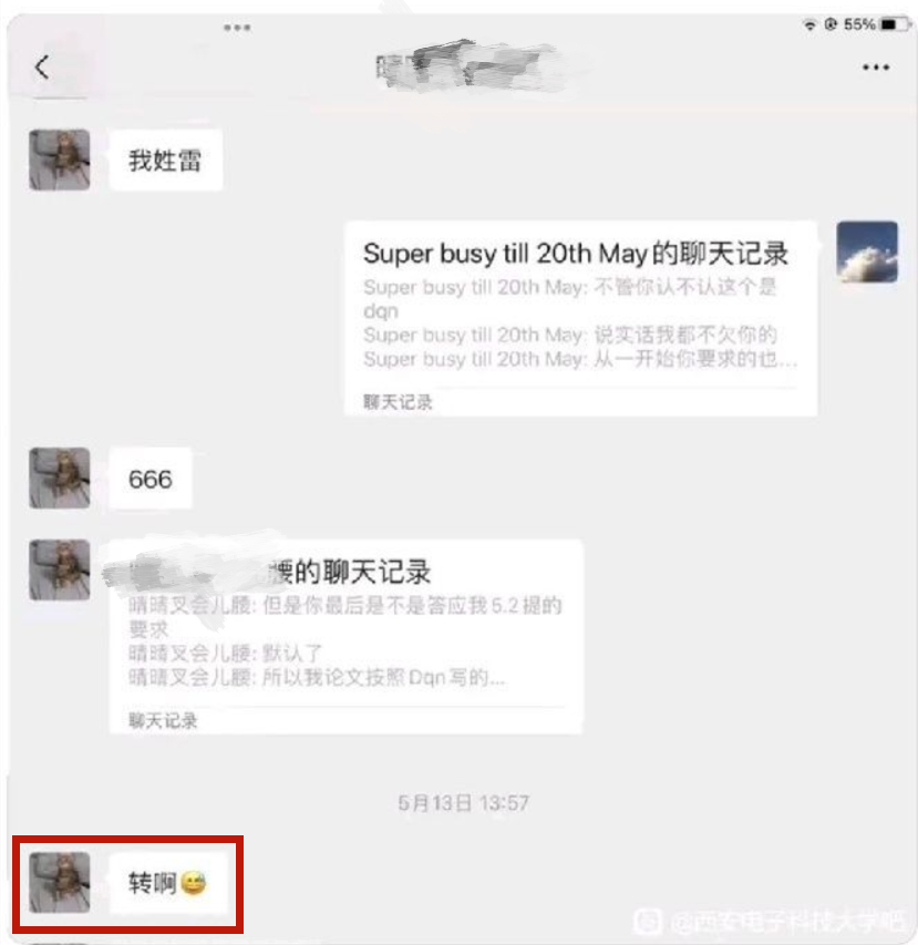 后来因为双方谈不拢,该同学要求枪手退钱,并表示「赶快转账过来,不然就举报了。」