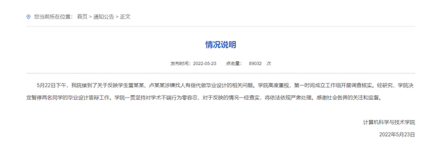 5月22日下午,我院接到了关于反映学生雷某某、卢某某涉嫌找人有偿代做毕业设计的相关问题。学院高度重视,第一时间成立工作组开展调查核实。经研究,学院决定暂停两名同学的毕业设计答辩工作。学院一贯坚持对学术不端行为零容忍,对于反映的情况一经查实,将依法依规严肃处理。感谢社会各界的关注和监督。