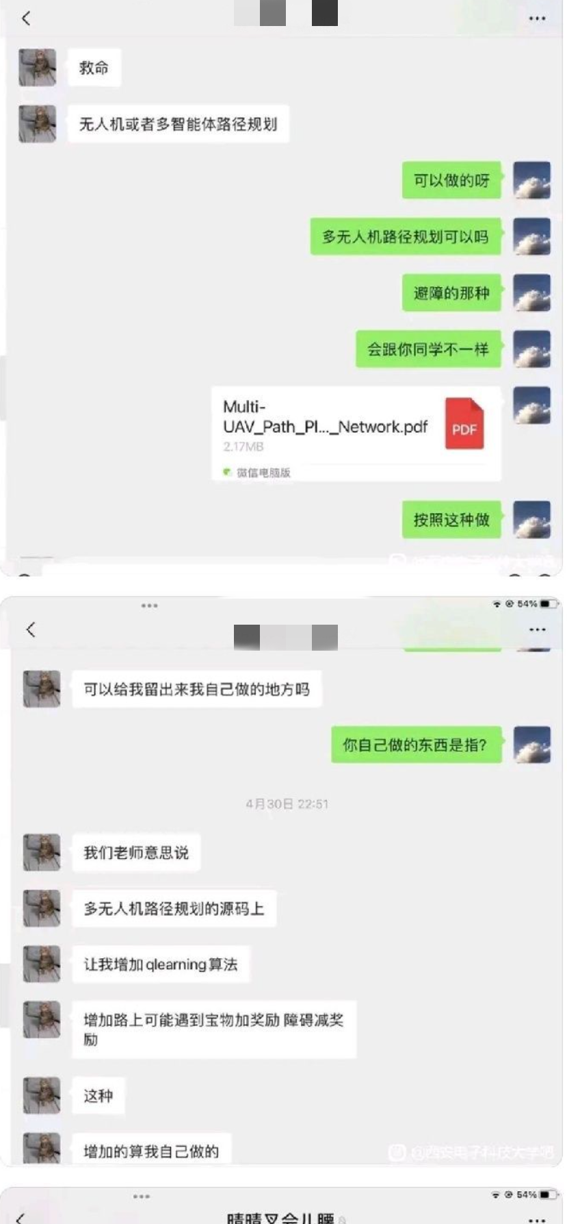 在帖子里,该“枪手”先放出来了一位同学的下单过程,表示她的毕设是和无人机路径规划相关的。