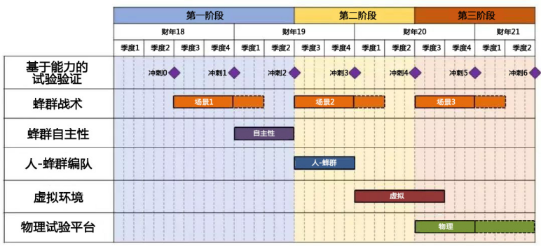 第三次冲刺:2018年10月发起,该冲刺侧重于人-蜂群协同和先进蜂群战术两个重点领域。2019年4月,DARPA宣布第四次冲刺中的先进蜂群战术合同授予内基·梅隆大学和腾飞科技有限公司[11];2019年8月,DARPA宣布人-蜂群协同交互合同授予凯斯西储大学、查尔斯河分析公司和西北大学[12]。