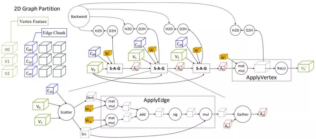 与在深度神经网络上的情况一样,高效使用 GPU 对 GNN 的性能至关重要,而且由于处理大型图结构的额外挑战,对 GPU 的使用就显得更为关键了。为了实现超越 GPU 物理限制的可扩展性,NGra 显式地将图结构划分(顶点和边数据)成块,将一个在 SAGA-NN 模型中表达的 GNN 算法转成了具有块粒度 operator 的数据流图,通过该数据流图,作者可以在单个或多个 GPU 上进行基于块的并行流处理。