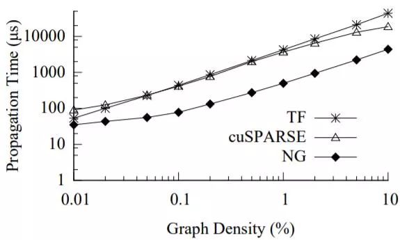 图 13:TensorFlow(TF),cuSPARSE,以及 NGra(NG)在不同密度的图上传播内核的时间。