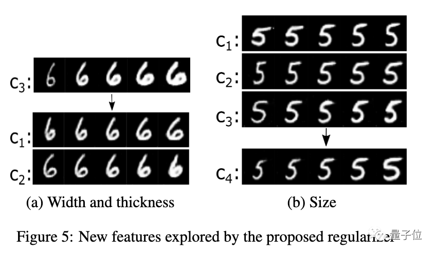 另外,研究人员发现,在使用该正则器学习的表征中,粗细度增加的同时,数字宽度也会增加。这暗示了宽度和粗细特征之间存在信息纠缠。
