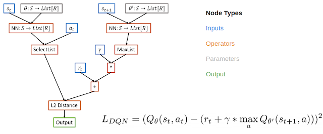 受 NAS 概念(搜索表示神经网络架构的图表空间)的启发,我们通过将 RL 算法的损失函数表示为计算图来元学习 RL 算法。在这种情况下,我们使用一个有向无环图表示损失函数,用节点表示输入、运算符、参数和输出。例如,在 DQN 的计算图中,输入节点包括重放缓冲区的数据,操作节点包括神经网络运算符和基本数学运算符,输出节点代表损失,可利用梯度下降算法达到最小值。
