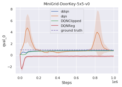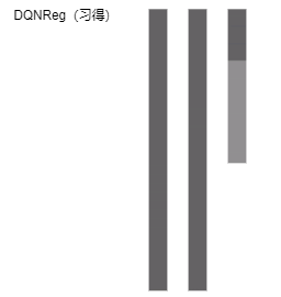 一项更深入的分析显示,虽然 DQN 等基线通常会高估 Q 值,但我们的习得算法都以不同的方式解决这一问题。DQNReg 会低估 Q 值,而 DQNClipped 的做法则类似于 double dqn,它会缓慢地接近基本事实,而不是高估它。