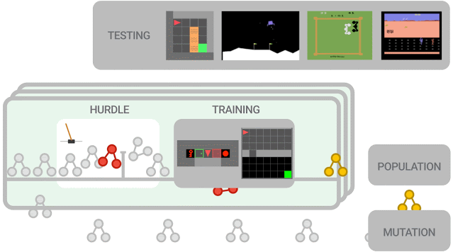 我们采用一种基于进化的方法来优化相关的 RL 算法。首先,用随机图初始化一系列训练代理。在一组训练环境中并行训练这些代理。首先在障碍环境,即简单的环境中加以训练,如 CartPole,旨在快速淘汰表现不良的程序。