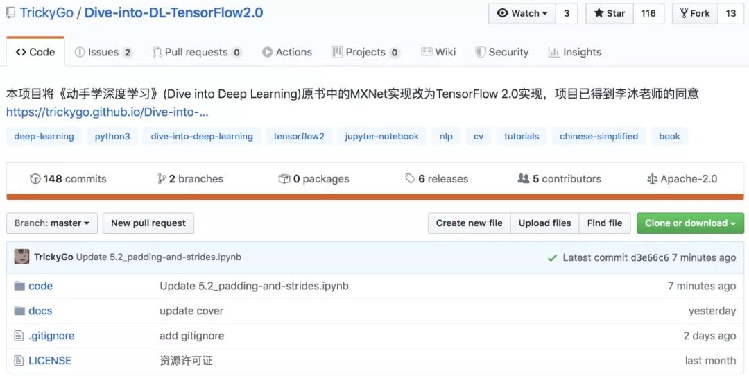 本项目将《动手学深度学习》(Dive into Deep Learning)原书中的MXNet实现改为TensorFlow 2.0实现,项目已得到李沐老师的同意。
