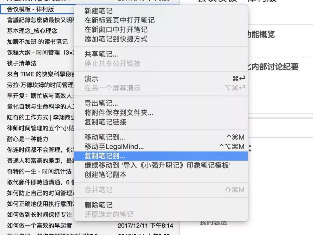 第一种是「复制笔记到…」,在笔记上右键,点击并选择目标位置。