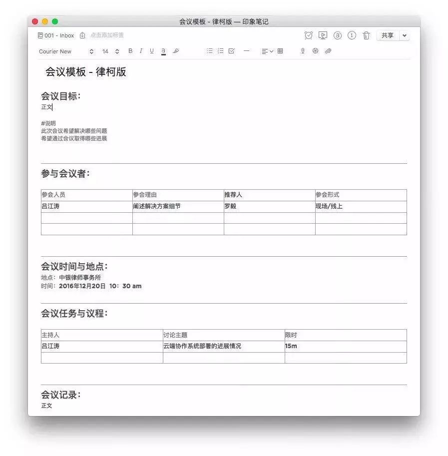 可千万别小瞧了这个「大表格」,一个优秀的模板背后一定渗透着卓越的思维方式、反复的流程优化,就像一个融汇了万千智慧的压缩包。最关键的是,你可以以模板为基础,自我定制和持续更新,配合自己的需求打造专属系统。作为印象笔记的用户,第一件事情就是将其改造成印象笔记的版本,同步世界 500 强企业的开会流程啦。