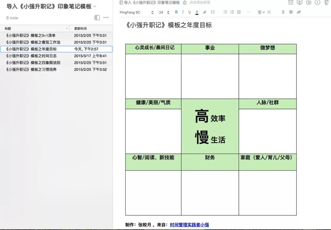 我虽然主张用专业的工具,类似 Todoist、OmniFocus 等工具管理任务和时间,但是不得不承认,身边总有些牛人,用纸笔和印象笔记也把每一天过得效率爆棚。所以,放下执念,在这里也推荐我很喜欢的一个 GTD 践行者邹小强老师制作的模板,里面包含番茄工作法、年度目标、时间日志等模板,供大家选择。