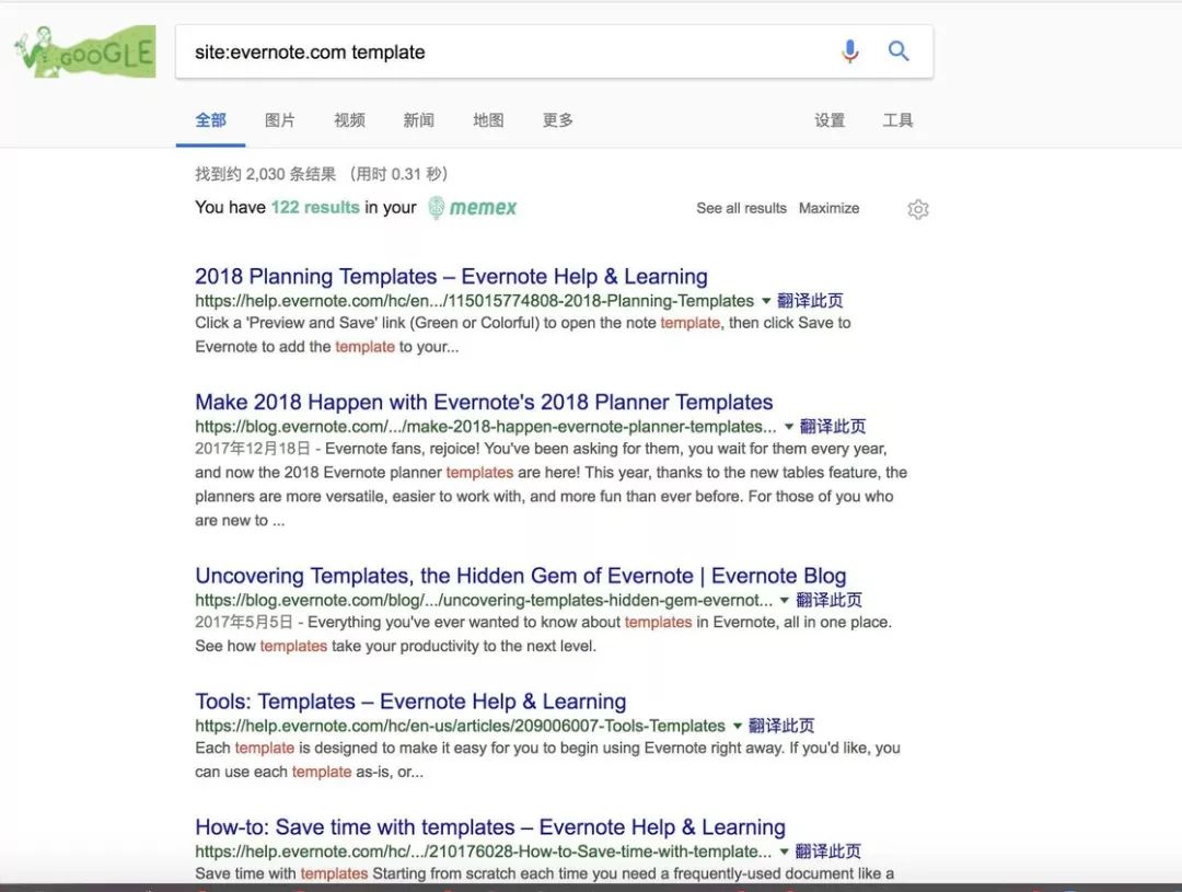 另一方面,我们前面提到要学会更多挖掘官方的优质资源,因此建议大家试一下搜索语法 site,在搜索引擎中输入类似 site:evernote.com 模板、site:evernote.com template、site:yinxiang.com 模板
