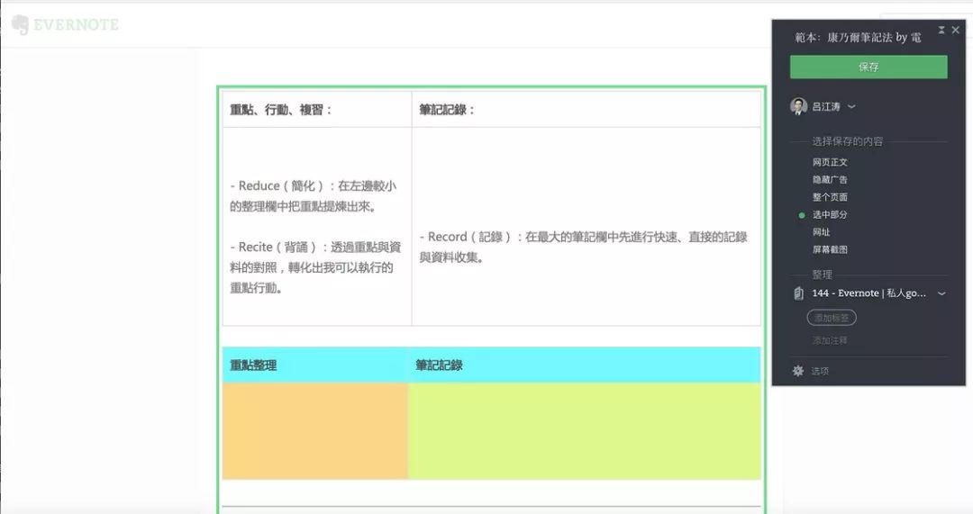 受 Evernote 国际版和印象笔记的账号体系的限制,上面这个模板不能直接点击页面右上角的「保存到 Evernote」。不过解决方法非常简单,你可以使用印象笔记的剪藏功能或者干脆直接选中复制页面的内容,粘贴到笔记中,两种方法都可以在 10 几秒内解决问题。