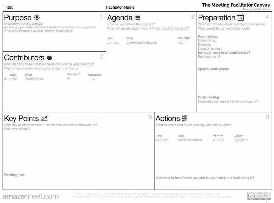 上面这张图是专业的会议服务提供商 AmazeMeet 提供的 Meeting Facilitator Canvas,感兴趣的朋友可以登录他们的官网,下载 PDF 和 Word 版本,打印或者直接在文件上填写都很方便。AmazeMeet 还配套提供了使用模板的一些简易教程,非常贴心。