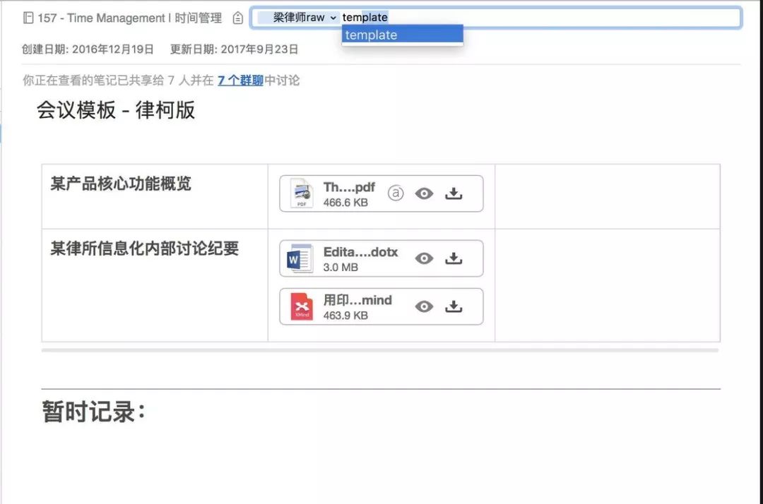 模板笔记本会成为你所有笔记本中非常重要的一类笔记,特别是在团队里,最好建立模板数据库,把这些模板笔记放到一起,可以放到一个笔记本,也可以都贴上相同的标签(也可以是「段落标签」),方便在使用的时候能够以更低的成本调取。
