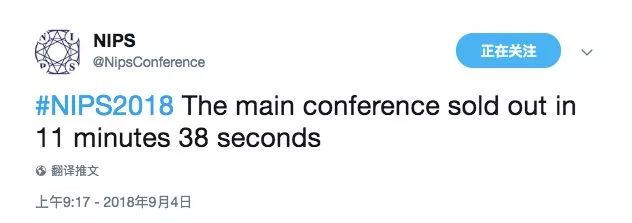最后,对AI从业者来说,最重要是能参会。但是NeurIPS2018的门票比霉霉的演唱会门票还难抢,主办方于 9 月 4 日 8 点开放注册,但仅用了11分钟38秒主会议门票就售罄,半小时后,tutorial和workshop的票也全部显示Sold Out。