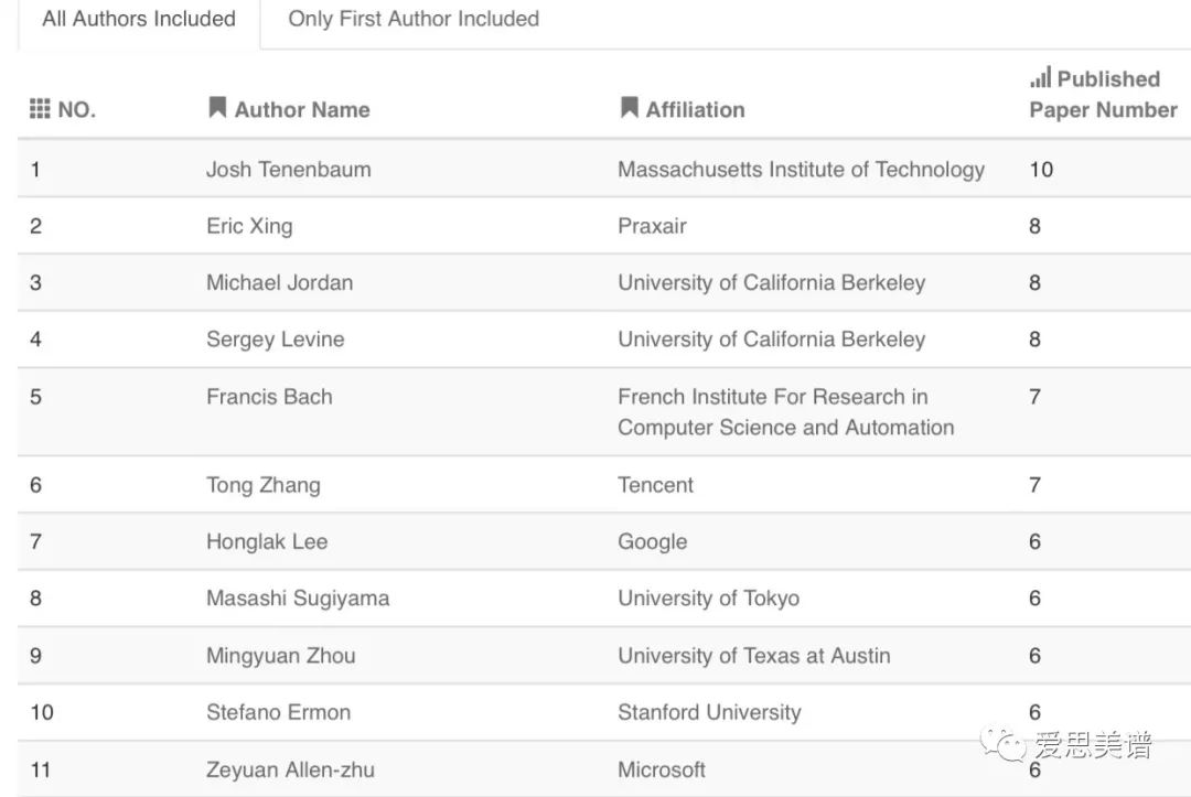 前十名中,华人学者有Eric Xing(邢波)、Tong Zhang(张潼)、Honglak Lee、Mingyuan Zhou(周明远)。