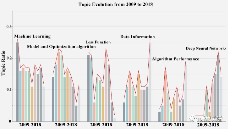 我们提取了NeurIPS 2009-2018十年的摘要信息,利用word embedding算法将关键词映射到向量空间,然后进行聚类。对每一个聚类赋予相应的话题,总体上分为图中六大类。图中横轴代表年份,纵轴代表话题所占比例,从图中可以看到六大话题十年间的演变趋势。
