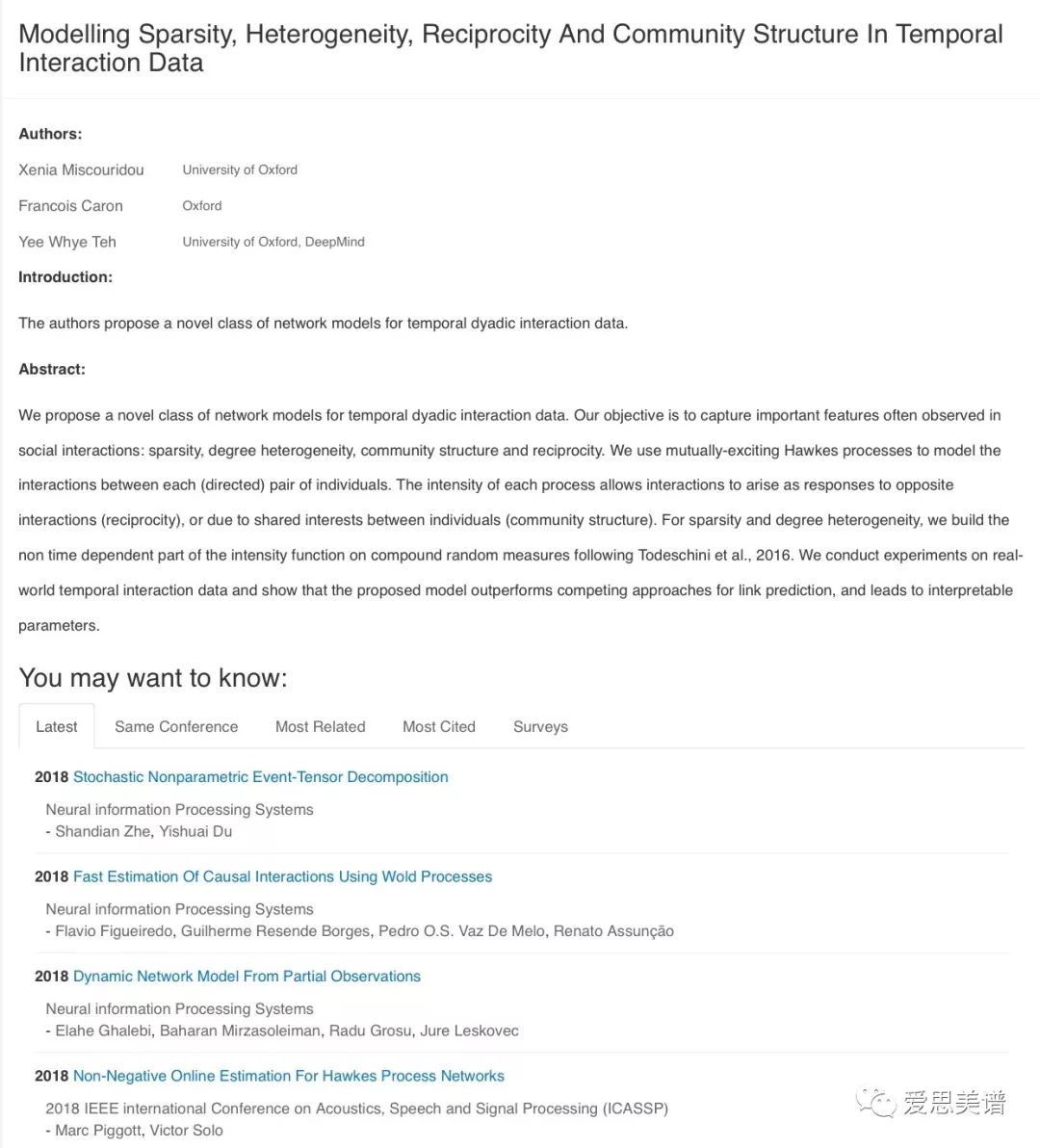 我们从五个维度对每篇论文进行了相似论文推荐,形成论文推荐矩阵。这些维度包括最新、同会议、最相关、被引用数最多和导读类论文,这种多维度推荐能够满足不同用户的不同需求。AceMap针对NeurIPS 2018各篇论文的相似论文推荐页面如下如所示: