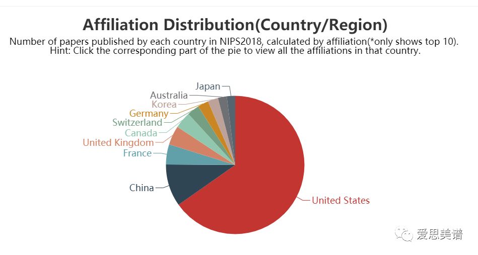 NeurIPS 2018 Affiliation Distribution统计了2018年发表NeurIPS论文的机构所在国家的分布情况,目前只统计了发表论文数量前十位的国家,以及每个国家所发表论文的数量和比例分布情况。