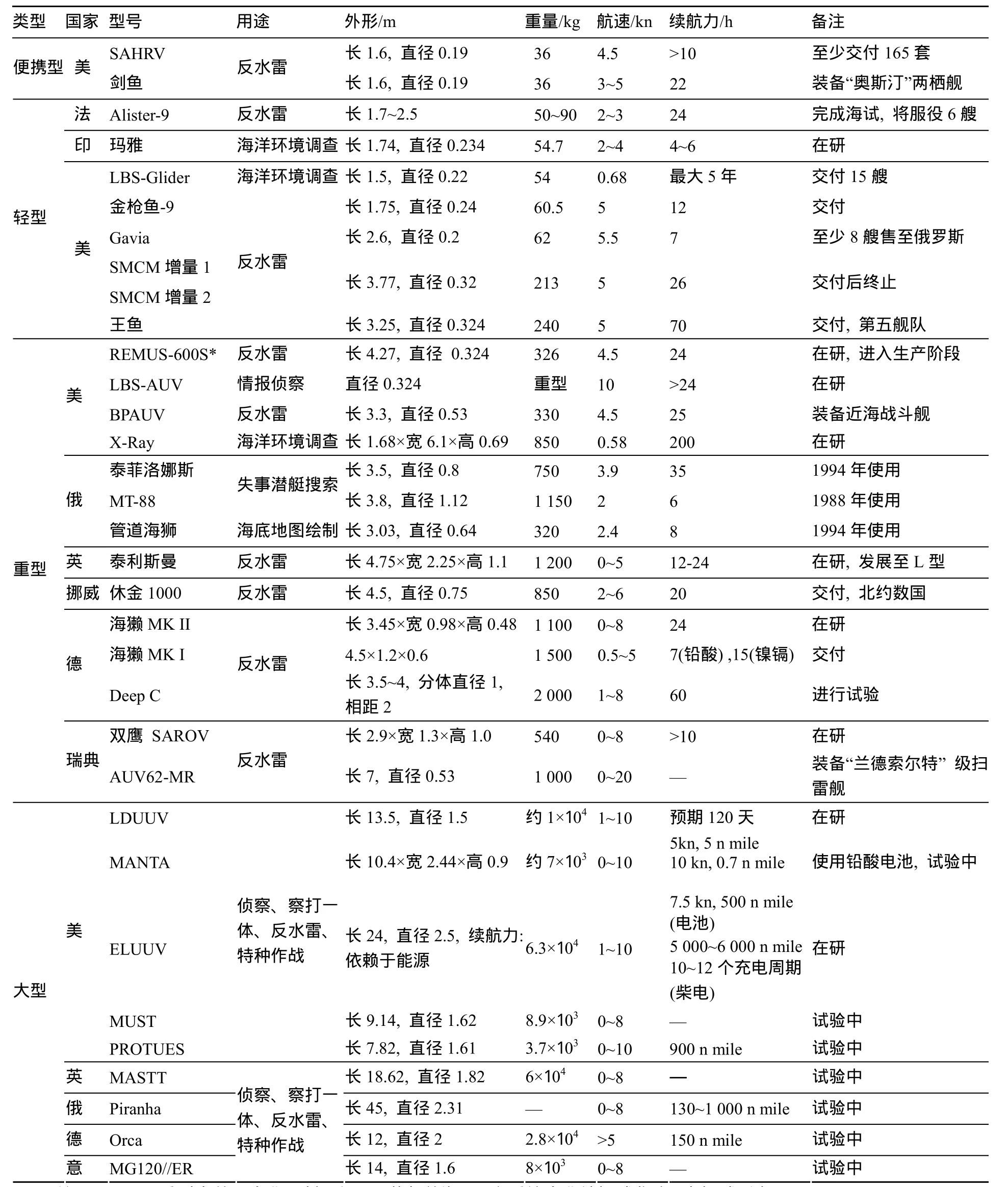 主要海军国家典型 UUV装备体系及主要技术指标分别见图3和表1。