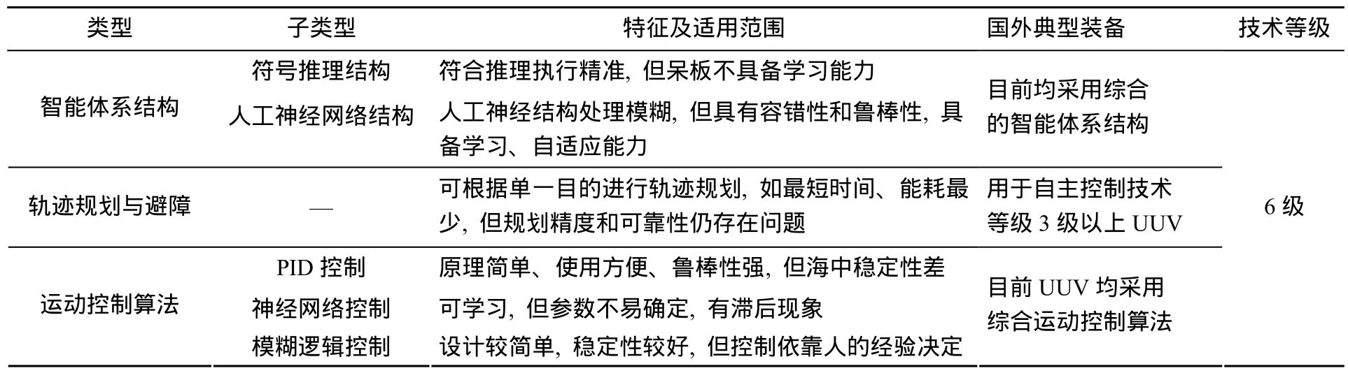 UUV的自主控制涉及诸多方面,包括综合运用智能体系结构、轨迹规划与避障、运动控制算法等技术,它们决定了 UUV如何处理获取的数据、如何模拟思考和行动过程。先进的UUV能在预定路径上进行一定程度的自主判断,如避障、迂回及路径优化等,紧急时还能利用水声通信对 UUV进行干预,自主控制技术等级达到6级(见表3)。