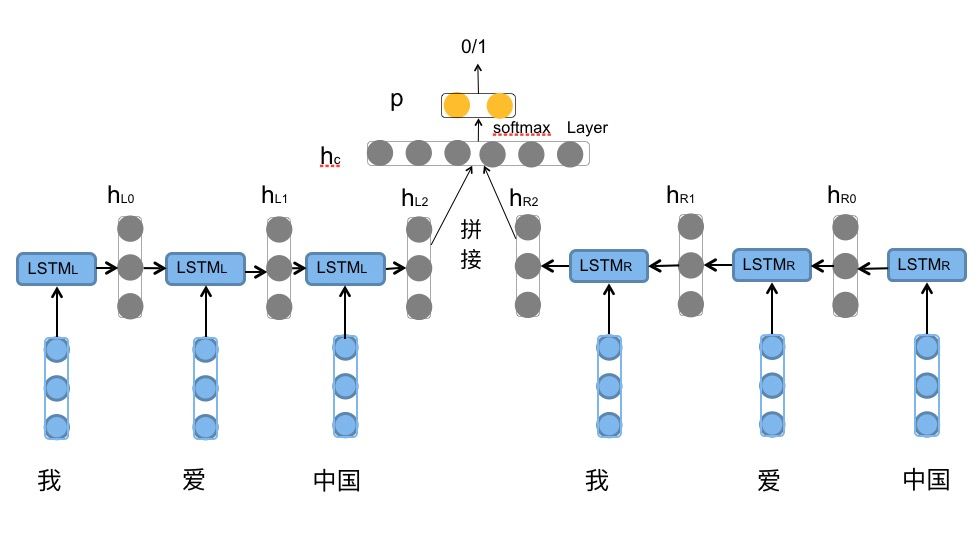 前向的依次输入“我”,“爱”,“中国”得到三个向量{