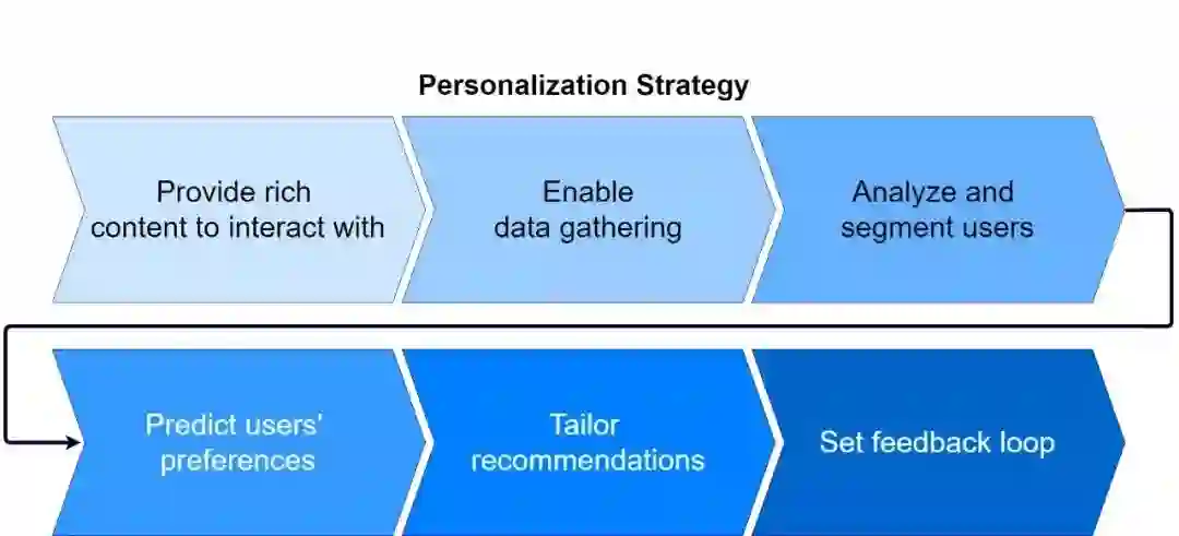 从图中可以看出,实现个性化定制,需要经历6个步骤,分别是:提供丰富内容;收集数据;细分用户;预测用户偏好;个性化推荐;获得反馈。
