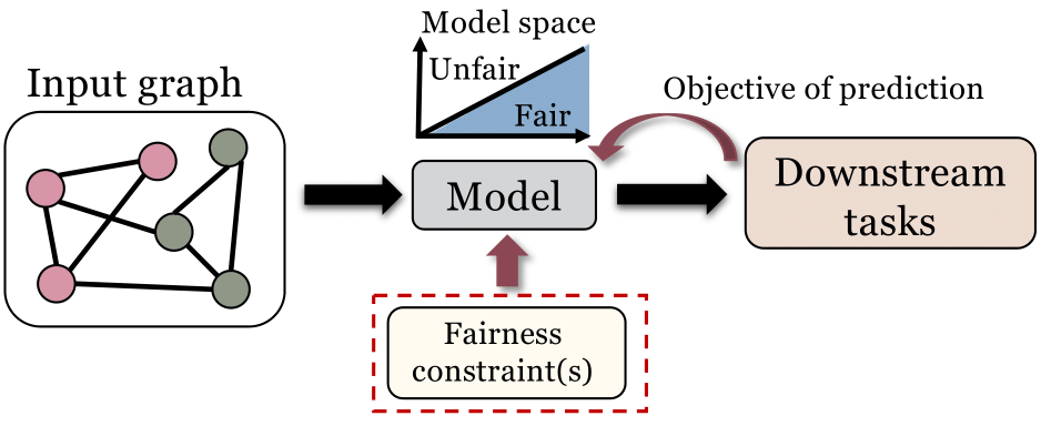 很多图数据挖掘算法是基于优化问题来的。对于这类算法,针对优化设计特殊的约束条件以实现算法公平性也是一个常用的方法。比如,在图谱聚类算法中,[5]要求图谱聚类算法的结果应该满足:每一个聚类中个体数量在全体中的占比应该与从属于任意集体的成员在本聚类中数量的比例相近。我们在综述中详细介绍了约束优化如何被用于提升集体公平性和个人公平性。