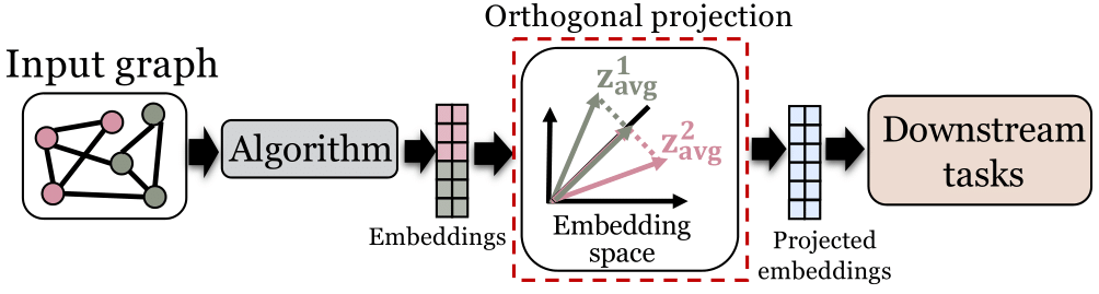 正交投影方法的基本理念是:如果能找到一个与偏见正交的超平面,那么只需要保证图数据挖掘算法的输出始终处在这个超平面内,就可以在理论上保证输出与偏见线性不相关。在本篇综述中,有关正交投影的介绍主要围绕节点表示学习展开:我们详细介绍了正交投影如何被用于提升节点表示学习算法的集体公平性。