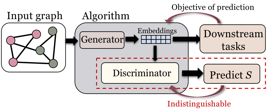 对抗学习是应用非常广泛的提升图学习算法集体公平性的方法。这种方法大致要求即使通过学习,经过特定设计的神经网络模型也无法基于某些输出(比如节点表示和预测结果)准确预测个体所属的集体,也就是他们的敏感特征。在这种情况下,这些输出就被认为是与敏感特征相互解耦的。[1]和[3]都属于这类方法。我们在综述中详细介绍了再平衡如何被用于提升集体公平性,以及这种方法在知识图谱中的应用。