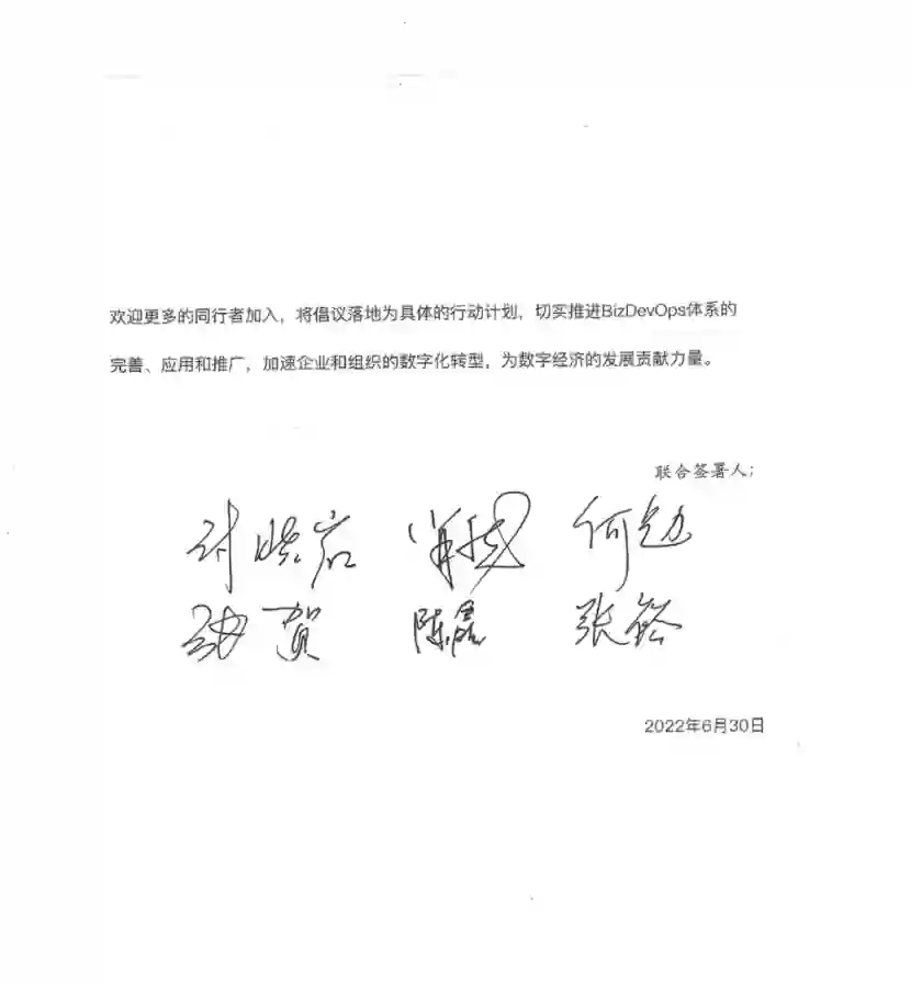 因此圆桌会后,6 位老师共同起草了一份《BizDevOps 行动倡议书》并联名签署,这意味着接下来,产业、学术、研究等各方将进行长期的协作和努力,共同推动软件构建与交付方式的变革。