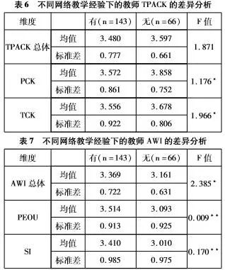 3.教龄、网络教学经验是教师TPACK及网络接受度AWI的重要影响因素