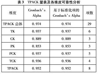 对因子分析删减题目后的TPACK量表各维度进行信度分析(见表3),可得TPACK量表及其内部各维度Cronbach’sα系数在0.853到0.974之间,说明TPACK量表具有较高的可靠性。