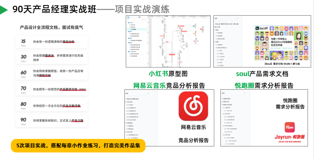 因此在课程中,我们安排了5次产品项目实战,个人自主选择一个项目方向,与组员进行从0到1的项目落地和作品输出。