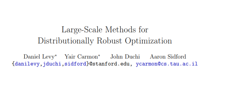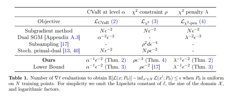 我们提出并分析了具有条件风险值(CVaR)的凸损失分布鲁棒优化算法和有条件风险值的χ2发散不确定性集。我们证明了我们的算法需要大量的梯度评估,独立于训练集的大小和参数的数量,使它们适合大规模的应用。对于χ2的不确定性集,这些是文献中第一个这样的保证,对于CVaR,我们的保证在不确定性水平上是线性的,而不是像之前的工作中那样是二次的。我们还提供了下界来证明我们的CVaR算法的最坏情况的最优性和一个惩罚性的版本的χ2问题。我们的主要技术贡献是基于[Blanchet & Glynn, 2015]的批量鲁棒风险估计偏差的新界和多层蒙特卡洛梯度估计器的方差。