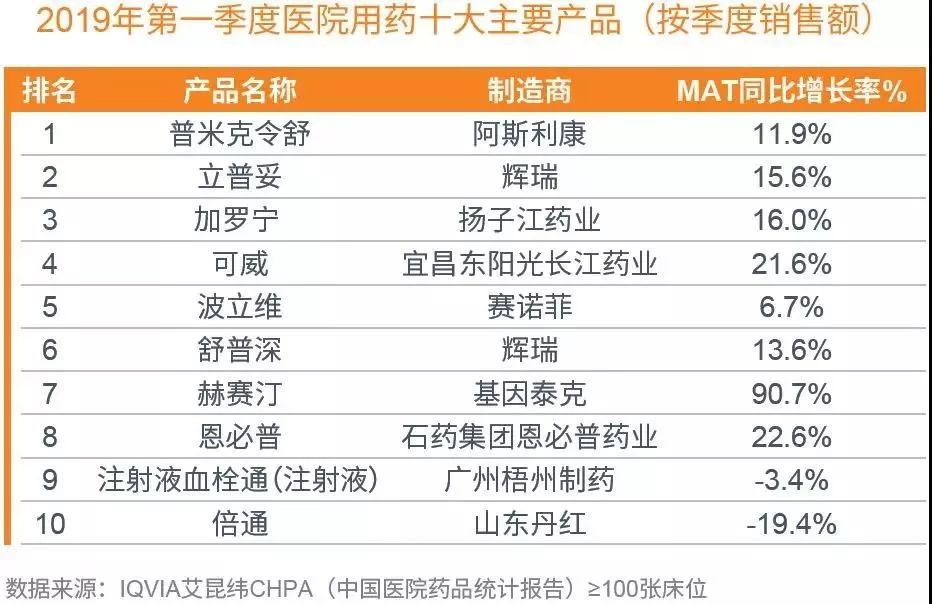 从产品的季度销售额来看,阿斯利康的普米克令舒重回第一,辉瑞的立普妥和扬子江药业的加罗宁分列第二、第三位。从 MAT 同比增长率看,赫赛汀同比增长率最高,达到 90.7%,恩必普、可威的增长率也均超过 20%,高于 Top 10 的其他产品。