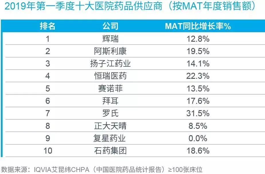 跨国企业 2019 年第一季度的销售额达到 576 亿元,同比增长仍然强劲,达到 15.1%;本土企业第一季度的销售额约为 1489 亿元,增长率为 6.3%,相比去年同期,增速显著提升。跨国企业 MAT 年销售额近 2146 亿人民币,增长率达 11.9%;本土企业 MAT 年销售额为 5735 亿元,增长率为 1.7%。以 MAT 年销售额排名,辉瑞、阿斯利康和扬子江药业位列企业排名三甲。大部分排名前十的企业 MAT 同比增长率均远超平均值,罗氏和恒瑞医药的 MAT 增长率分别达到 31.5% 和 22.3%。