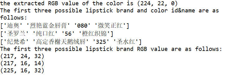 实际上是比较 RGB 三个分量维度上的误差,最小的口红输出对应的品牌、系列、色号和 id。