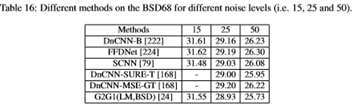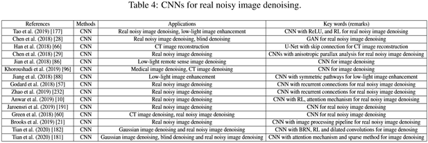 单一的end-to-end的CNN和CNN和先验知识的结合。对于第一类,设计网络结构对处理真实噪声图像是流行的。把多尺度、Skip connection、batch renormalization、dilated convolutions、attention mechanism融合到CNN中都能有效处理真实噪声图像。这些方法的详细信息被展示在表4: