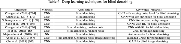 对于提高去噪效率,把优化方法嵌入到CNN来寻找最优解决是不错工具。此外,把噪声映射和噪声图像块作为CNN的输入也能提高预测噪声的速度。对于提高去噪的性能,把CNN和先验知识结合起来能有效移除噪声。表3展示The combination of optimization method and CNN/NN for AWNI denoising方法的详细信息。