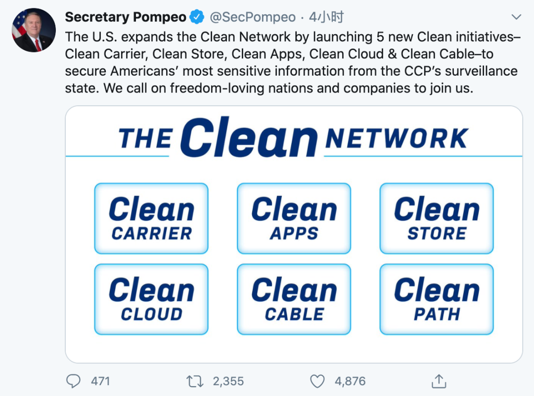 8 月 5 日,美国国务卿蓬佩奥召开记者会,宣布了一项旨在“遏制潜在的国家安全风险”的清洁网络计划,这一计划覆盖 5 个领域,包括运营商、应用商店、应用程序、网络云和网络设备。该计划点名了包括华为、中国移动、百度、阿里巴巴在内的 7 家中国科技公司,指出要在美国应用商店里禁止包括 TikTok、微信在内的“不受信任”中国 App,同时进一步限制中国云服务提供商在美国收集、存储和处理数据的能力。