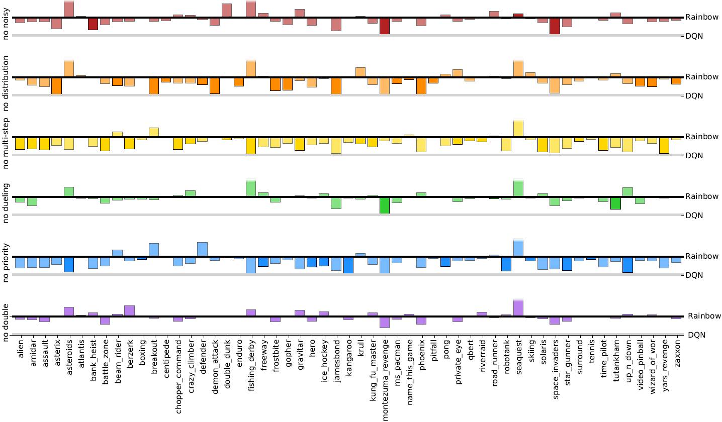 图 4. 所有 57 个 Atari 游戏的独立智能体(ablation agents)性能下降测试。性能是学习曲线下的面积,相对于 Rainbow 智能体和 DQN 进行了规则化。其中,DQN 超越 Rainbow 的两种游戏被剔除了。导致性能下降最严重的组件在每个游戏中都被高亮显示了。删除优先级和多步骤学习在大多数游戏中造成的性能影响最大,不过每个组件在不同游戏中的影响各有差异。