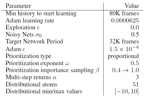 表 1. Rainbow 的超参数。在 57 种 Atari 游戏的测试中,研究使用了同一个智能体和参数。