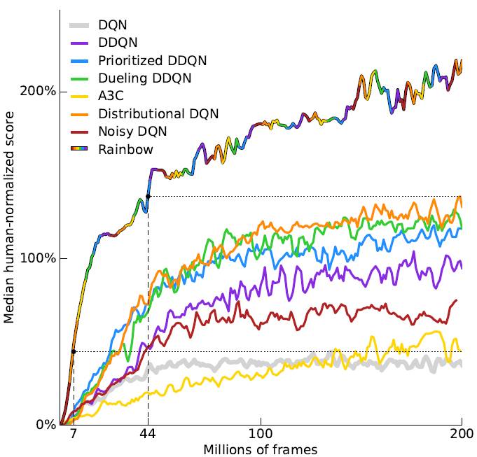 以上这些算法各自都可以提升 DQN 性能的某个方面,因为它们都着力于解决不同的问题,而且都构建在同一个框架上,所以能够被我们整合起来。在一些例子中这种方法已经被使用过了:Prioritized DDQN 和 Dueling DDQN 都使用了 Q 学习,Dueling DDQN 也结合了 prioritized experience replay。在 DeepMind 最近发表的论文中,研究人员讨论了综合上述所有方法的整合性方案,并提出了单智能体系统:Rainbow。研究人员展示了整合后的表现,证明了它们很大程度上是互补的。实际上,这些组合在 57 个 Atari 2600 游戏组成的基准测试环境中在数据效率和最终结果上都达成了新的业界最佳水平。该研究也提供了分类测试结果,显示了每种组件对于提升性能的贡献。