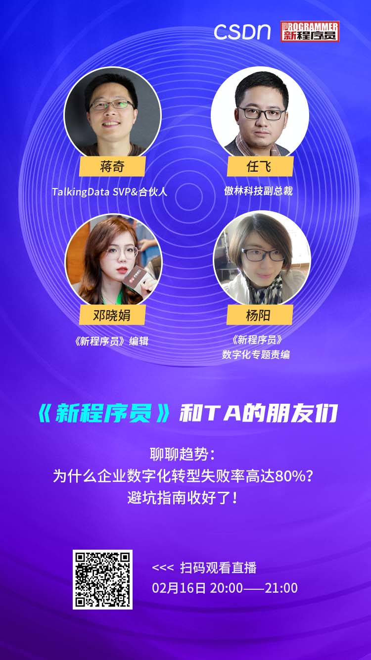 今晚 20:00,将邀请到《新程序员003》专家作者:TalkingData SVP & 合伙人蒋奇、傲林科技副总裁任飞莅临直播间,以及数字化转型专题责编杨阳与《新程序员》编辑邓晓娟和各位读者朋友“面对面”,针对目前企业数字化转型“不知该往哪转”、以及观念误区、技术误区等问题进行解读,让更多企业管理者和开发者避免在企业数字化转型道路上盲目“踩坑”。